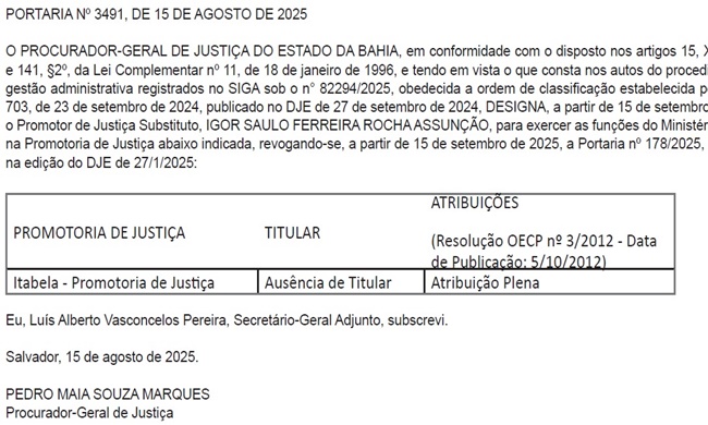 Foi publicado no Diário de Justiça Eletrônico (DJE), em 15 de agosto de 2025, o nome do Promotor de Justiça, Igor Saulo Ferreira Rocha Assunção, para titular na promotoria de Itabela a partir de 15 de setembro de 2025.