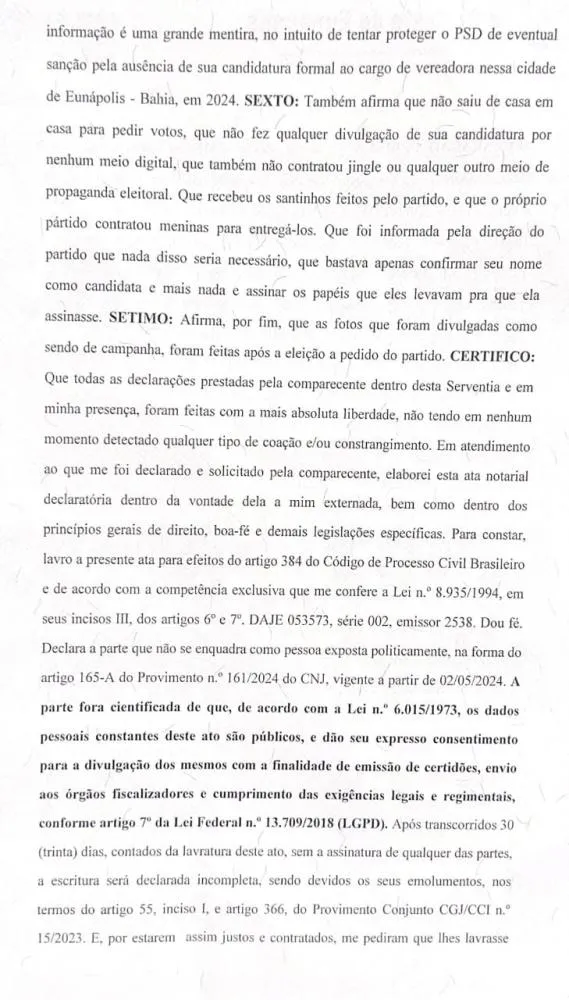 📜 Documentos lavrados em cartório e declarações prestadas ao Ministério Público Eleitoral mostram que Ritinha afirma ter sido usada pelo partido. Na escritura pública, ela declara: