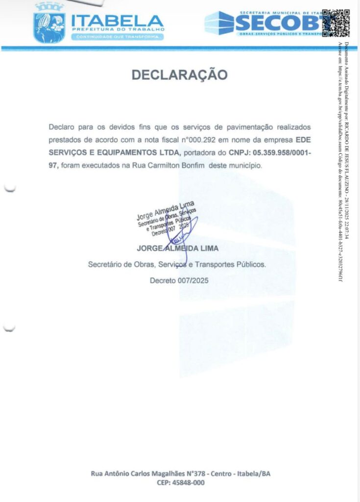 “O serviço especificado na nota fiscal nº 00292 foi fornecido e recebido pela Secretaria Municipal de Obras, Serviços Públicos e Transporte, conforme contrato nº TP02/2023, tendo como objeto a contratação de empresa especializada em serviço de pavimentação nas diversas ruas do município de Itabela, e que os serviços foram executados de acordo com as exigências especificadas.”