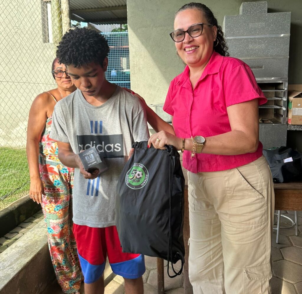 Associação Os 50 Mais realiza ação social e beneficia crianças e adolescentes de escolinha com kits esportivos em Itabela.